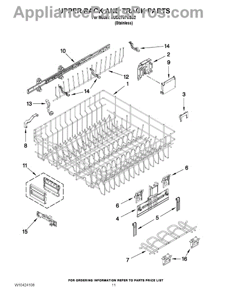Causes of a bad Track, Asm (RH) can include wear from regular use, accumulation of debris that impairs movement, or damage from improper loading of the dishwasher rack.