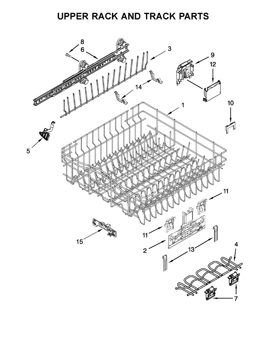 Right-hand track assembly that guides the upper dishwasher rack as it slides in and out. Replace if cracked, broken, or ball bearings fall out.