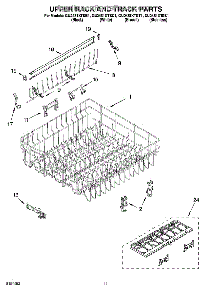 The Upper Dish Rack is an OEM replacement part for Whirlpool dishwashers. Located on the upper level inside the tub, it provides an area for washing smaller dishes, utensils, and glasses.