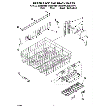 The Upper Dish Rack is an OEM replacement part for Whirlpool dishwashers. Located on the upper level inside the tub, it provides an area for washing smaller dishes, utensils, and glasses.