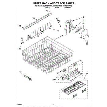 Upper dish rack assembly for dishwashers. Holds glasses, cups, and small items on the top level. Replace if cracked, warped, rusted, or deteriorating.