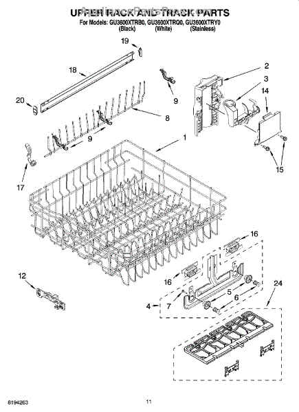 Guides the upper rack smoothly in and out of your dishwasher. Replace if cracked, broken, or wheels no longer roll properly along the track.