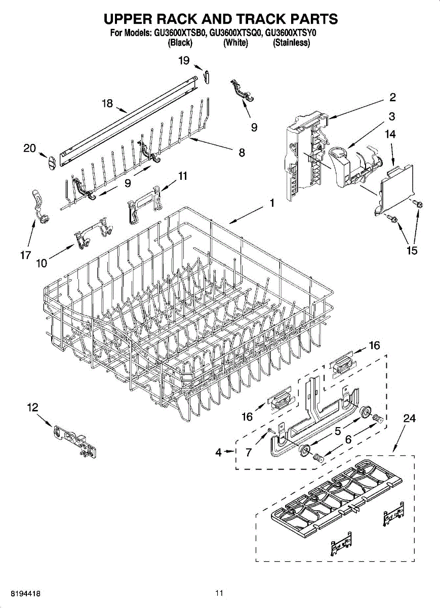 Parts for Whirlpool GU3600XTSB0: 09 - Upper Rack And Track Parts