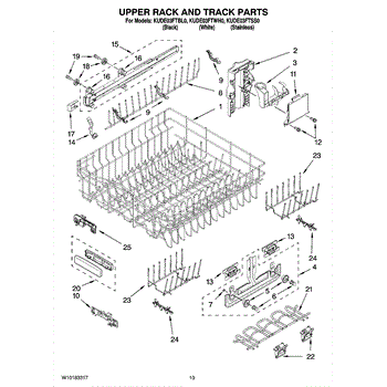 This genuine replacement part is an upper dishrack. The upper dishrack is the top shelf of a dishwasher that holds plates, bowls, and utensils. Over time through continuous use, this upper rack may become damaged, making it difficult to secure dishes during a wash cycle. If the dishrack is visibly damaged or no longer opening and shutting properly, it will need to be replaced. Thankfully, replacing this dishrack is a relatively simple process.To remove the old dishrack, simply pull it out and lift the wheels from its track. Set it off the side, and lift the new dishrack. Slide it into its track and make sure it is locked in. If it is gliding in and out smoothly, it has been installed properly.This genuine replacement part is compatible with Whirlpool, Maytag, KitchenAid, Jenn-Air, Amana, Magic Chef, Admiral, Norge, Roper, and Sears/Kenmore brand dishwashers.