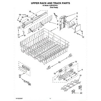 The Upper Dishrack is an OEM part for Whirlpool dishwashers. This dishrack is designed to hold dishes, glasses, and other items securely in the upper part of the dishwasher during the wash cycle, allowing for effective cleaning and efficient use of space.
