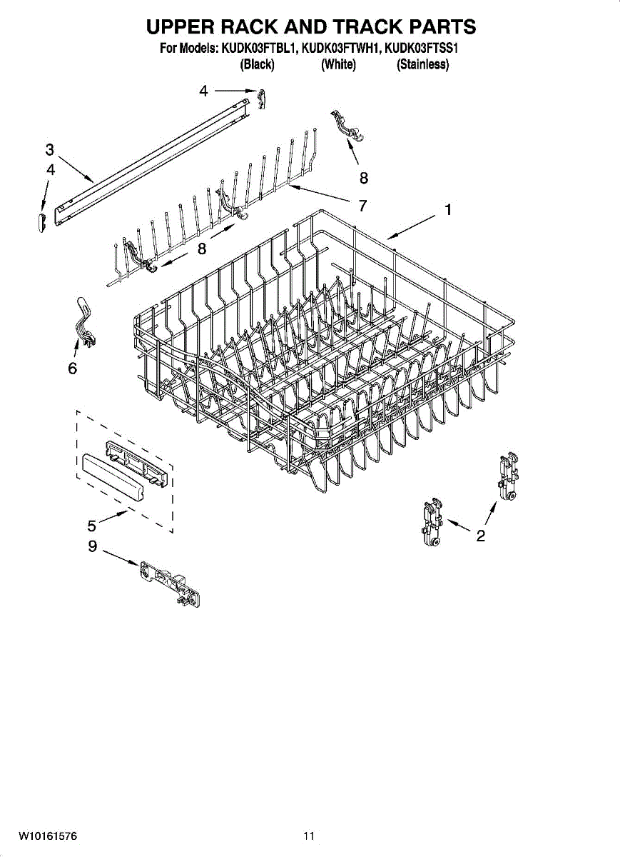 Upper dish rack assembly for dishwashers. Holds glasses, cups, and small items on the top level. Replace if cracked, warped, rusted, or deteriorating.