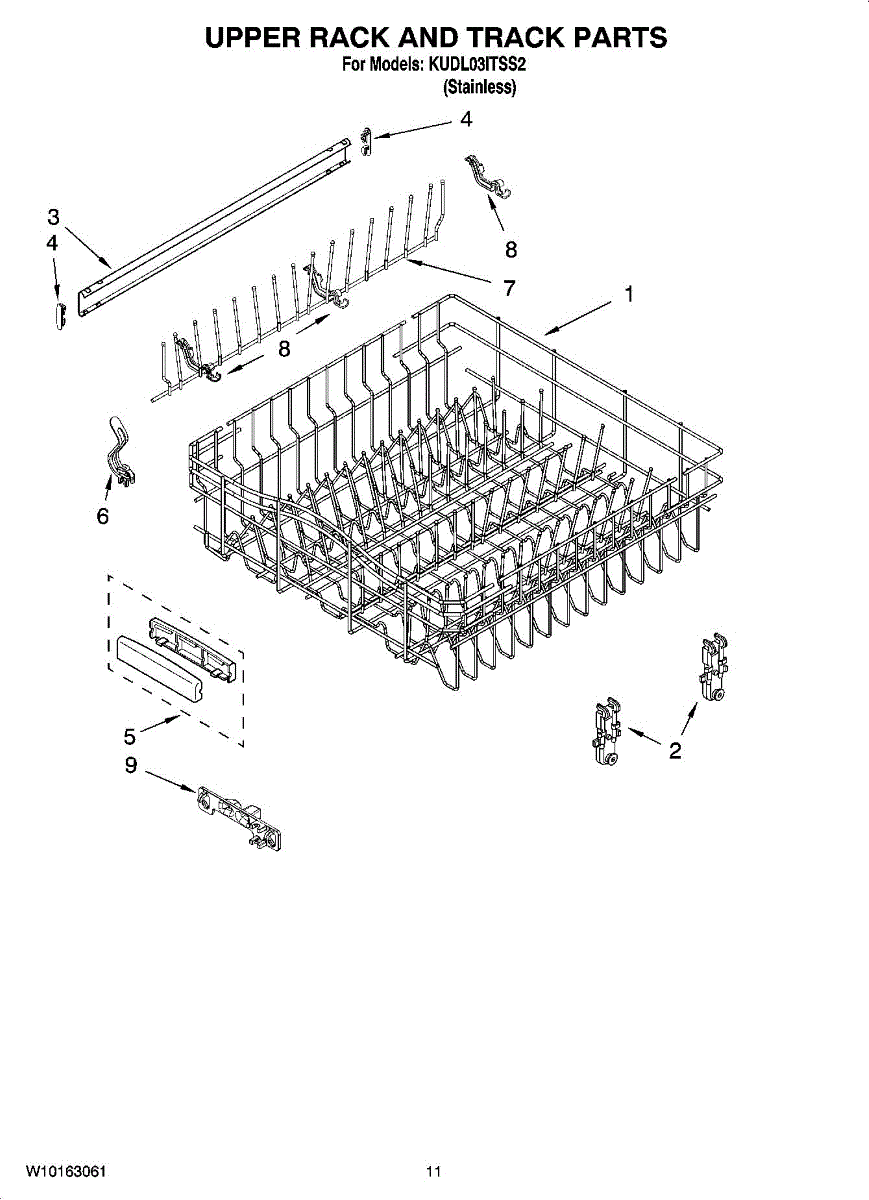 Upper dish rack assembly for dishwashers. Holds glasses, cups, and small items on the top level. Replace if cracked, warped, rusted, or deteriorating.