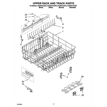 This genuine replacement part is an upper dishrack. The upper dishrack is the top shelf of a dishwasher that holds plates, bowls, and utensils. Over time through continuous use, this upper rack may become damaged, making it difficult to secure dishes during a wash cycle. If the dishrack is visibly damaged or no longer opening and shutting properly, it will need to be replaced. Thankfully, replacing this dishrack is a relatively simple process.To remove the old dishrack, simply pull it out and lift the wheels from its track. Set it off the side, and lift the new dishrack. Slide it into its track and make sure it is locked in. If it is gliding in and out smoothly, it has been installed properly.This genuine replacement part is compatible with Whirlpool, Maytag, KitchenAid, Jenn-Air, Amana, Magic Chef, Admiral, Norge, Roper, and Sears/Kenmore brand dishwashers.