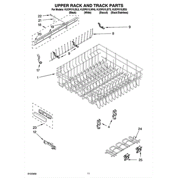 The Upper Dish Rack is an OEM replacement part for Whirlpool dishwashers. Located on the upper level inside the tub, it provides an area for washing smaller dishes, utensils, and glasses.
