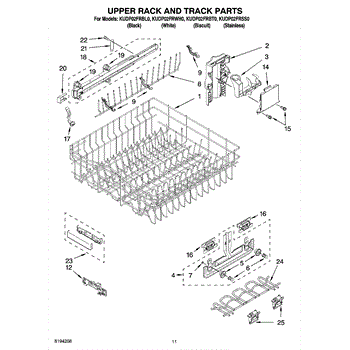 Upper dish rack assembly for dishwashers. Holds glasses, cups, and small items on the top level. Replace if cracked, warped, rusted, or deteriorating.