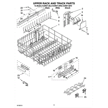 This genuine replacement part is an upper dishrack. The upper dishrack is the top shelf of a dishwasher that holds plates, bowls, and utensils. Over time through continuous use, this upper rack may become damaged, making it difficult to secure dishes during a wash cycle. If the dishrack is visibly damaged or no longer opening and shutting properly, it will need to be replaced. Thankfully, replacing this dishrack is a relatively simple process.To remove the old dishrack, simply pull it out and lift the wheels from its track. Set it off the side, and lift the new dishrack. Slide it into its track and make sure it is locked in. If it is gliding in and out smoothly, it has been installed properly.This genuine replacement part is compatible with Whirlpool, Maytag, KitchenAid, Jenn-Air, Amana, Magic Chef, Admiral, Norge, Roper, and Sears/Kenmore brand dishwashers.