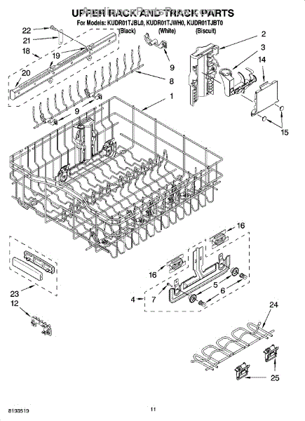 This genuine replacement part is an upper dishrack. The upper dishrack is the top shelf of a dishwasher that holds plates, bowls, and utensils. Over time through continuous use, this upper rack may become damaged, making it difficult to secure dishes during a wash cycle. If the dishrack is visibly damaged or no longer opening and shutting properly, it will need to be replaced. Thankfully, replacing this dishrack is a relatively simple process.To remove the old dishrack, simply pull it out and lift the wheels from its track. Set it off the side, and lift the new dishrack. Slide it into its track and make sure it is locked in. If it is gliding in and out smoothly, it has been installed properly.This genuine replacement part is compatible with Whirlpool, Maytag, KitchenAid, Jenn-Air, Amana, Magic Chef, Admiral, Norge, Roper, and Sears/Kenmore brand dishwashers.