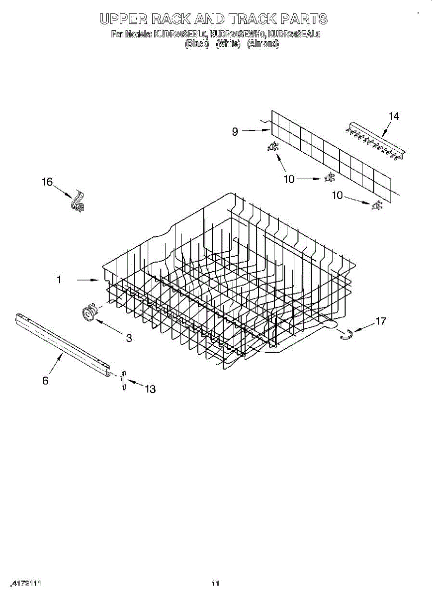 Upper dishrack assembly for dishwashers. Slides on tracks to hold dishes on the top shelf. Replace if cracked, rusted, broken tines, or no longer stable.