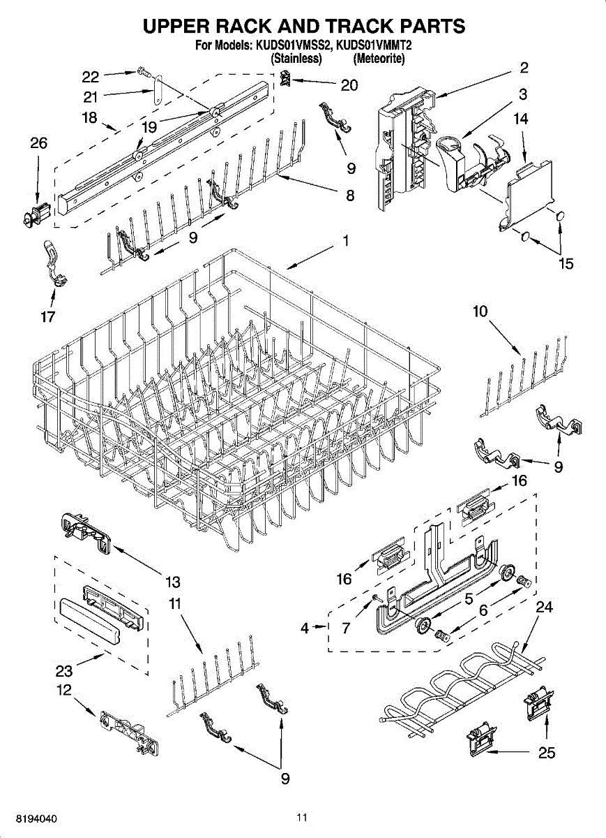 Upper dish rack assembly for dishwashers. Holds glasses, cups, and small items on the top level. Replace if cracked, warped, rusted, or deteriorating.