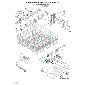 The Upper Dish Rack is an OEM replacement part for Whirlpool dishwashers. Located on the upper level inside the tub, it provides an area for washing smaller dishes, utensils, and glasses.