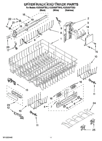 This genuine replacement part is an upper dishrack. The upper dishrack is the top shelf of a dishwasher that holds plates, bowls, and utensils. Over time through continuous use, this upper rack may become damaged, making it difficult to secure dishes during a wash cycle. If the dishrack is visibly damaged or no longer opening and shutting properly, it will need to be replaced. Thankfully, replacing this dishrack is a relatively simple process.To remove the old dishrack, simply pull it out and lift the wheels from its track. Set it off the side, and lift the new dishrack. Slide it into its track and make sure it is locked in. If it is gliding in and out smoothly, it has been installed properly.This genuine replacement part is compatible with Whirlpool, Maytag, KitchenAid, Jenn-Air, Amana, Magic Chef, Admiral, Norge, Roper, and Sears/Kenmore brand dishwashers.