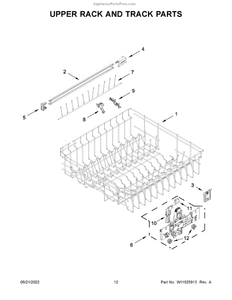 Replacement lower dish rack bar that restores support and alignment to the dishwasher's lower rack. It helps keep dishes steady and the rack running smoothly so dishes get proper wash coverage and don't tip. What it does