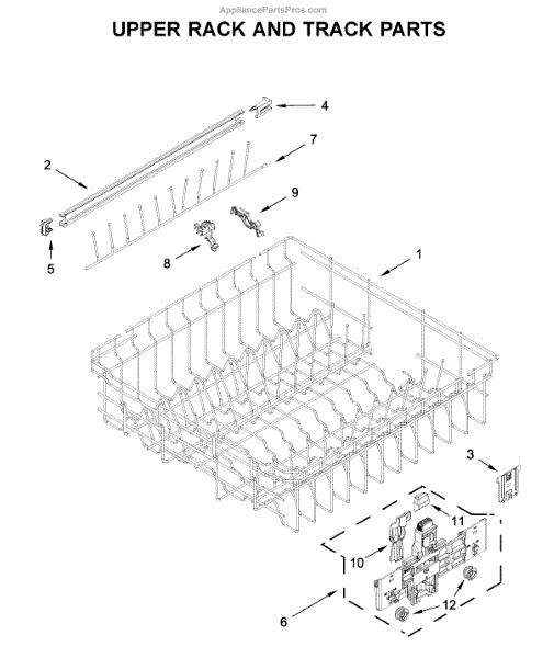 Replacement lower dish rack bar that restores support and alignment to the dishwasher's lower rack. It helps keep dishes steady and the rack running smoothly so dishes get proper wash coverage and don't tip. What it does