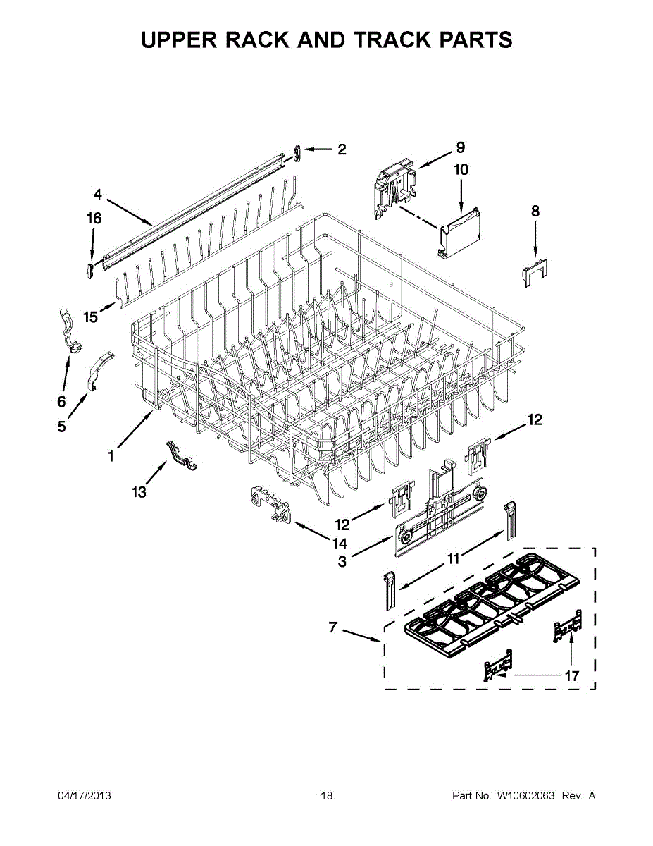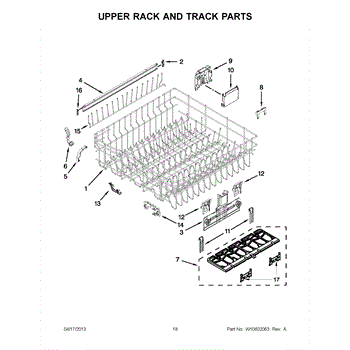 The Upper Dish Rack is an OEM replacement part for Whirlpool dishwashers. Located on the upper level inside the tub, it provides an area for washing smaller dishes, utensils, and glasses.