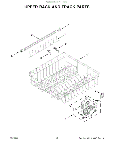 Replacement lower dish rack bar that restores support and alignment to the dishwasher's lower rack. It helps keep dishes steady and the rack running smoothly so dishes get proper wash coverage and don't tip. What it does