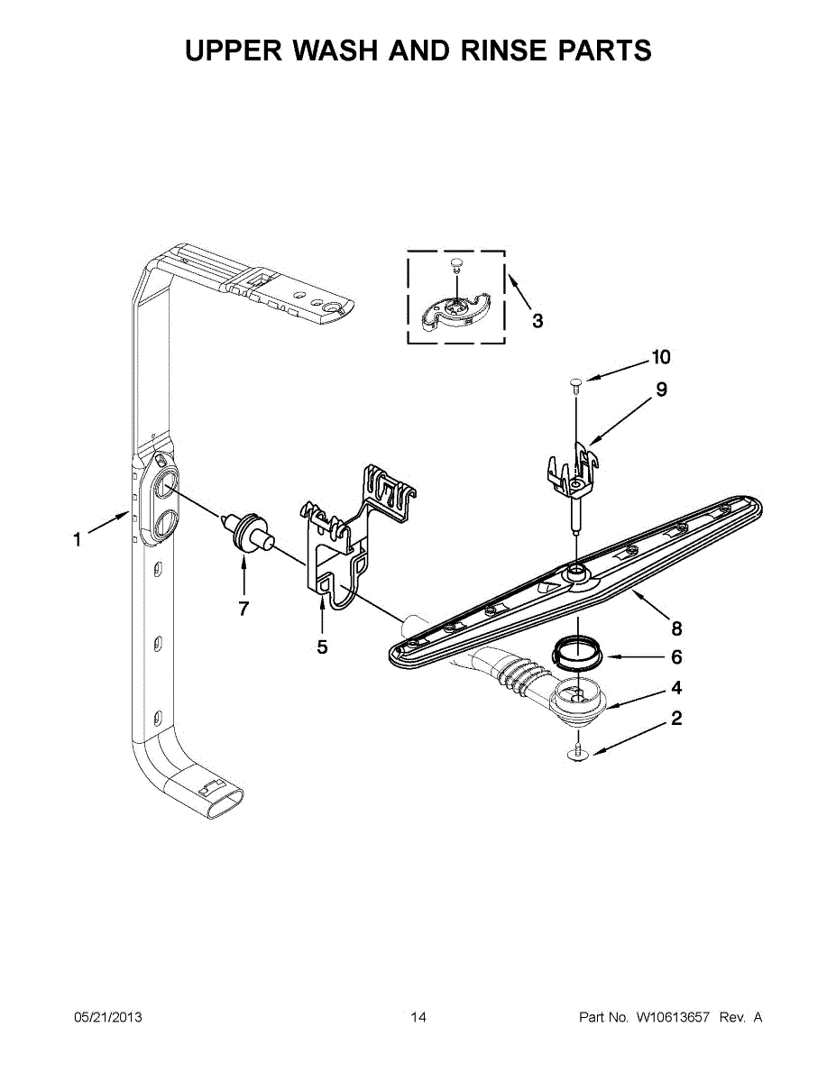 Secures the upper spray arm to the water feed. Replace if cracked, broken, or loose to restore proper arm alignment and rotation for the top rack.