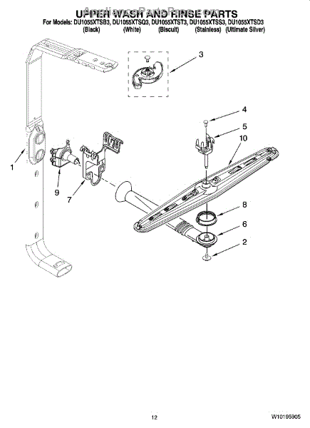 Parts for Whirlpool DU1055XTSS3: 10 - Upper Wash And Rinse Parts