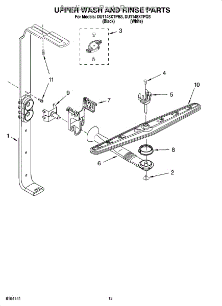 Parts for Whirlpool DU1148XTPB3: 10 - Upper Wash And Rinse Parts