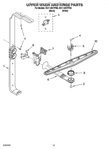 Parts for Whirlpool DU1148XTPQ6: 10 - Upper Wash And Rinse Parts