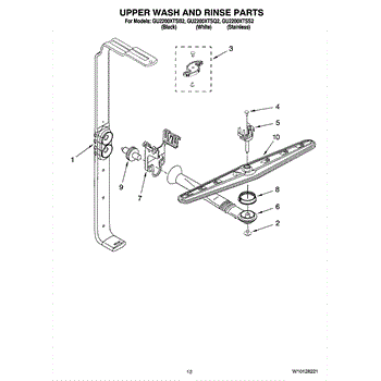 The upper spray arm distributes and spins wash water to clean items on the upper rack. Replacing a cracked or clogged arm restores proper spray coverage, rotation, and top-rack cleaning performance.