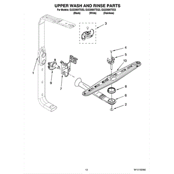 The upper spray arm distributes and spins wash water to clean items on the upper rack. Replacing a cracked or clogged arm restores proper spray coverage, rotation, and top-rack cleaning performance.