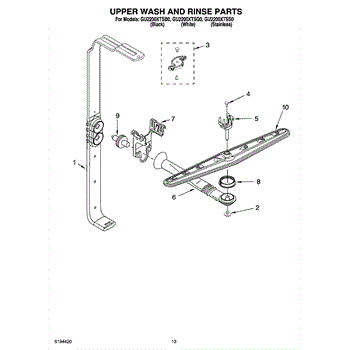 The upper spray arm distributes and spins wash water to clean items on the upper rack. Replacing a cracked or clogged arm restores proper spray coverage, rotation, and top-rack cleaning performance.