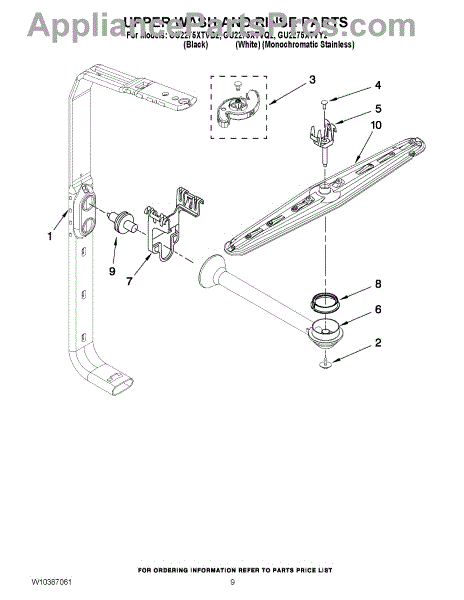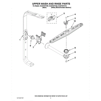 The upper spray arm distributes and spins wash water to clean items on the upper rack. Replacing a cracked or clogged arm restores proper spray coverage, rotation, and top-rack cleaning performance.