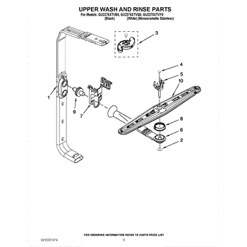 The upper spray arm distributes and spins wash water to clean items on the upper rack. Replacing a cracked or clogged arm restores proper spray coverage, rotation, and top-rack cleaning performance.