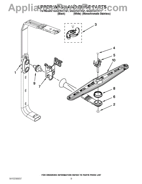 The upper spray arm distributes and spins wash water to clean items on the upper rack. Replacing a cracked or clogged arm restores proper spray coverage, rotation, and top-rack cleaning performance.
