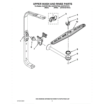 The upper spray arm distributes and spins wash water to clean items on the upper rack. Replacing a cracked or clogged arm restores proper spray coverage, rotation, and top-rack cleaning performance.