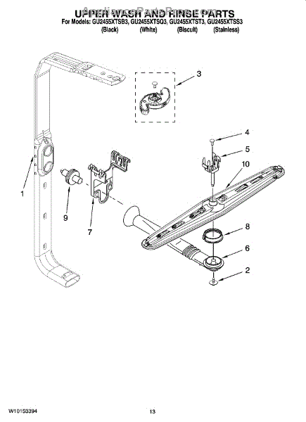 The upper spray arm distributes and spins wash water to clean items on the upper rack. Replacing a cracked or clogged arm restores proper spray coverage, rotation, and top-rack cleaning performance.