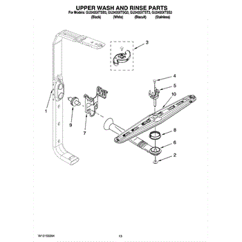 The upper spray arm distributes and spins wash water to clean items on the upper rack. Replacing a cracked or clogged arm restores proper spray coverage, rotation, and top-rack cleaning performance.