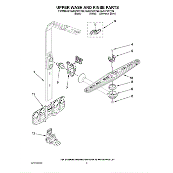 The upper spray arm distributes and spins wash water to clean items on the upper rack. Replacing a cracked or clogged arm restores proper spray coverage, rotation, and top-rack cleaning performance.
