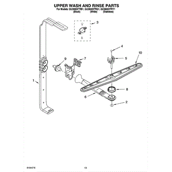 The upper spray arm distributes and spins wash water to clean items on the upper rack. Replacing a cracked or clogged arm restores proper spray coverage, rotation, and top-rack cleaning performance.