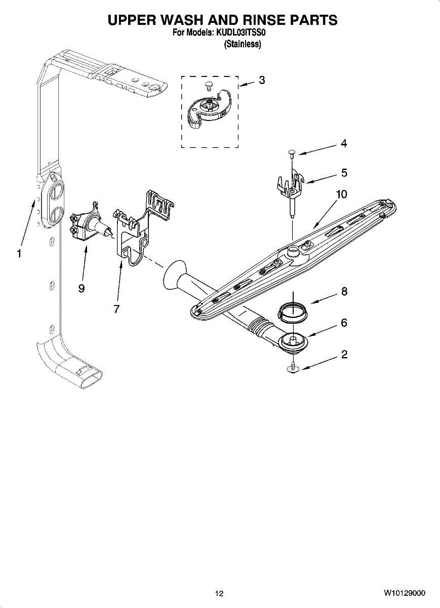 Top rack spray arm that rotates to distribute water across upper dishes. Replace if cracked, broken, or not spinning freely to restore water coverage.