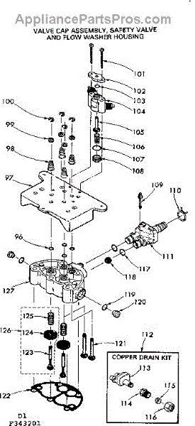 Parts for Kenmore 625.343201 (625343201, 625 343201): Valve Cap Assem, Safty Valve & Flow Washer Housing Parts