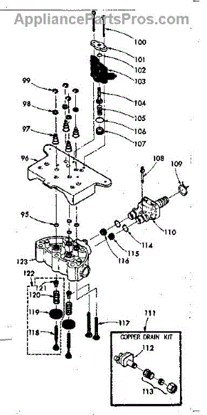 Parts for Kenmore 625.348101 (625348101, 625 348101): Valve Cap, Safety Valve And Flow Washer Housing Parts