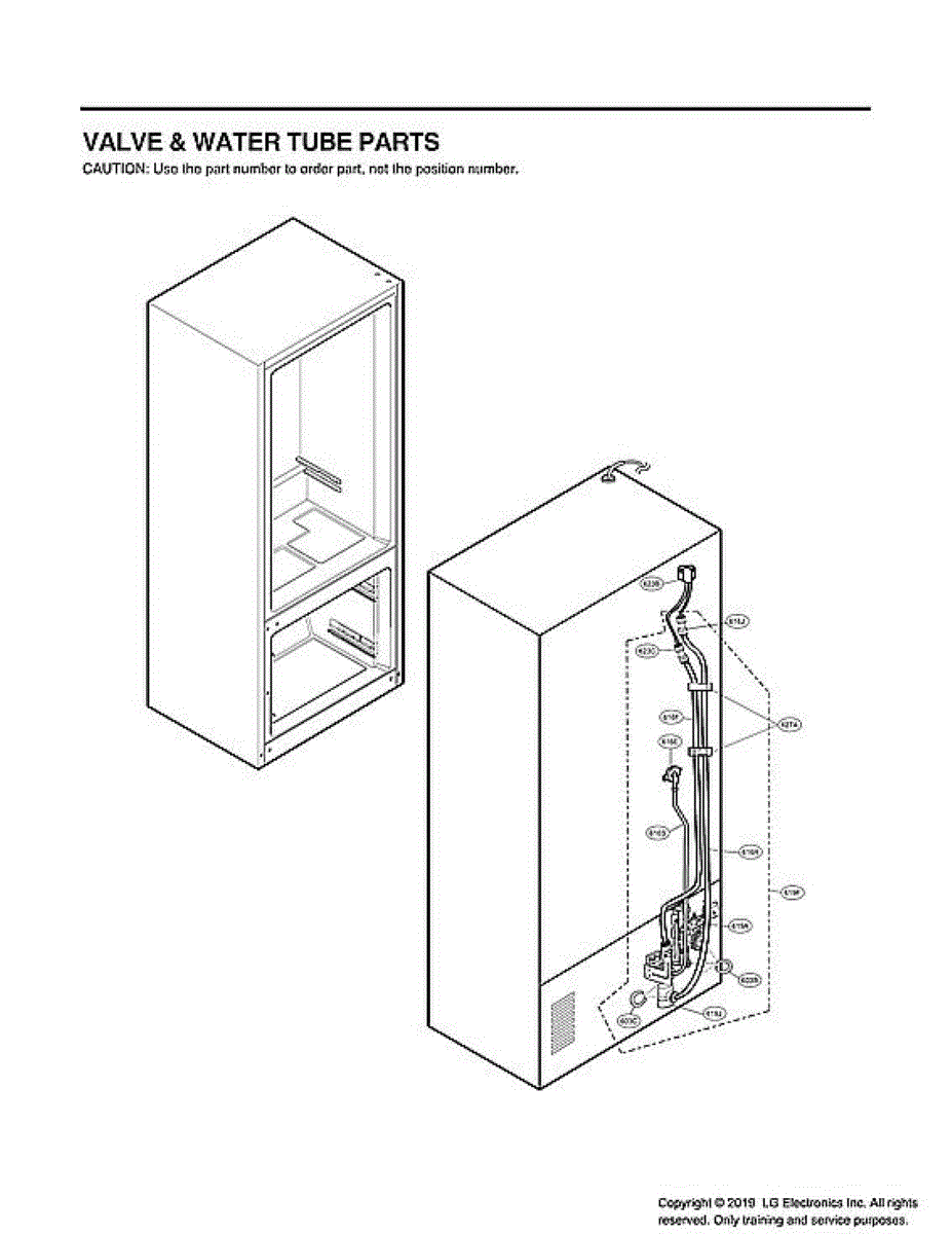 Secures and routes the water tube along the cabinet or door. Replace if cracked, broken, or missing to prevent kinks and keep tubing properly positioned.