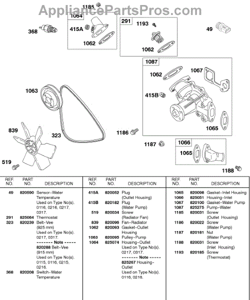 Parts for Briggs & Stratton 433447-0115-A1: Vee Belt, Radiator Fan, Water Pump Parts
