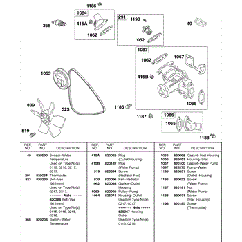 Parts for Briggs & Stratton 433447-0116-E2: Vee Belt, Radiator Fan, Water Pump Parts