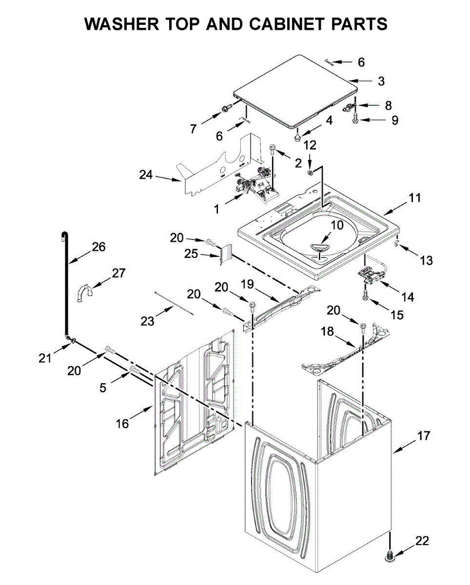 Replacement cabinet top for washers. Restores the appliance's upper exterior surface when original is dented, scratched, rusted, or damaged.