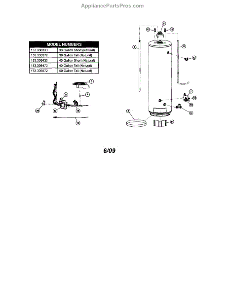 Parts for Kenmore 153.336433 (153336433, 153 336433): Water Heater-40 Gal Short (Natural) Parts