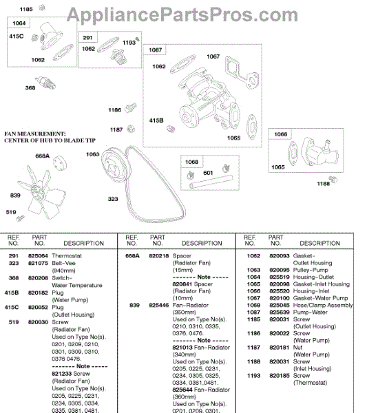 Parts for Briggs & Stratton 58A447-0305-E2: Water Pump, Radiator Fan, Fan Belt Parts