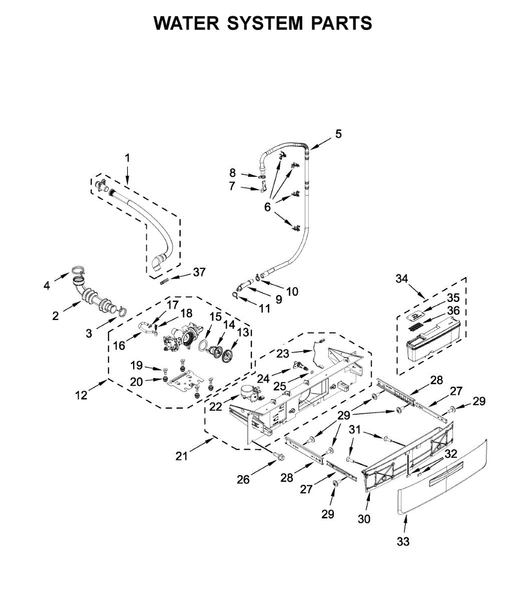 The Drain Hose is an OEM part for Whirlpool front-loading washers. This hose is responsible for transporting water from the washer tub out to the household plumbing drain.