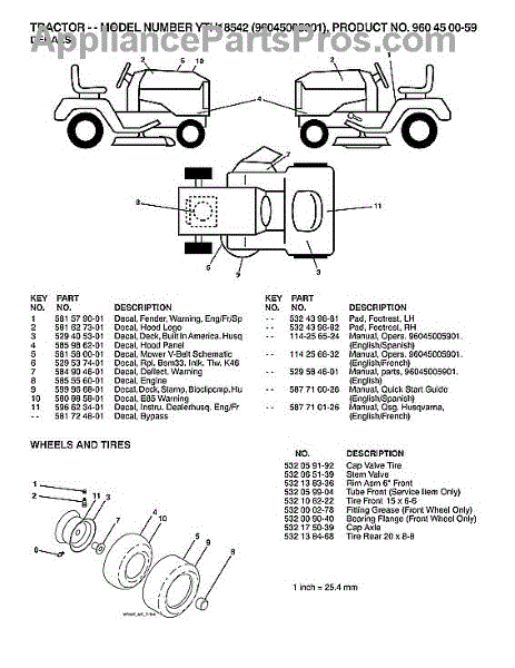 This is a rear tire for a lawn mower or lawn tractor. Tires are critical to the smooth, comfortable operation of a lawn mower, and their lifespan depends on how they are used. Lawn mower tires that are used more frequently, or on rougher terrain, will typically have a shorter lifespan. Lawn mower tires may lose traction over time with repeated use. They may also weaken and be unable to hold air pressure for long periods of time. Occasionally, a lawn mower tire may become punctured or damaged. Lawn mower tires may also degrade through exposure to extreme weather conditions, such as heat, rain, wind, and cold. A visual inspection can help determine whether it is time to replace the tire. Depending on the condition of the tires, it might be necessary to replace both rear tires at once. This can ensure a smooth, even mowing experience, and prevent additional damage to the mower. This lawn mower tire is an OEM part sourced directly from the manufacturer, and it is sold individually. It is compatible with lawn mowers and lawn tractors made by Jonsered, Poulan, Ariens, Husqvarna, Craftsman, Rally, Yard Pro, Murray, Ryobi, Weed Eater, Western Auto, Companion, and Southern States.